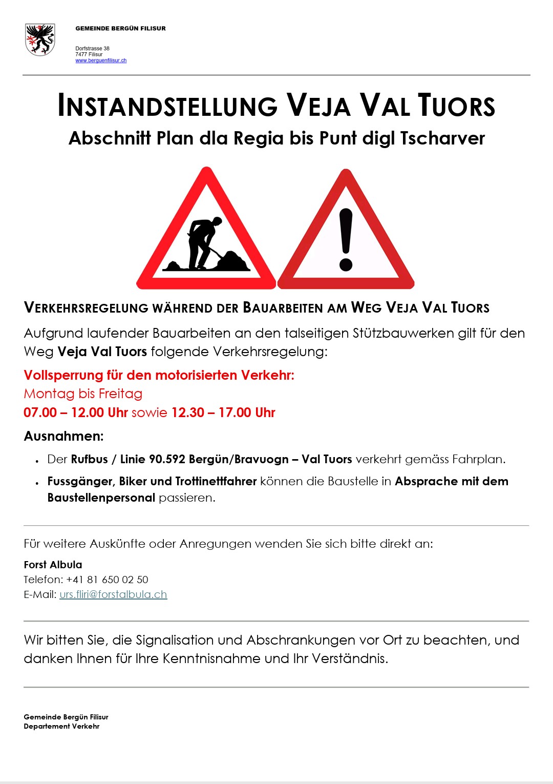 Gemäss Publikation ab 13. Oktober Einschränkungen für Fahrten in das Val Tuors. Für Fussgänger, Biker oder Trottinettfahrer ist das Passieren kein Problem.